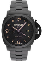 44mm black ceramic case, see-through sapphire crystal back, black ceramic bezel, black ceramic device protecting the crown, black dial with luminous Arabic numerals and hour markers, date at 3 o’clock, seconds at 9 o’clock, automatic Panerai P.9001/B calibre movement with hours, minutes, small seconds, date, approximately 3 days of power reserve ceramic bracelet. Water resistant to 100 meters.