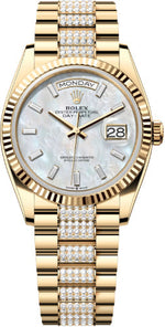 Rolex Day-Date 36 36mm White MOP Diamond-Set Dial Fluted Bezel with Diamond-Set President Bracelet - 128238 | 2024 Model